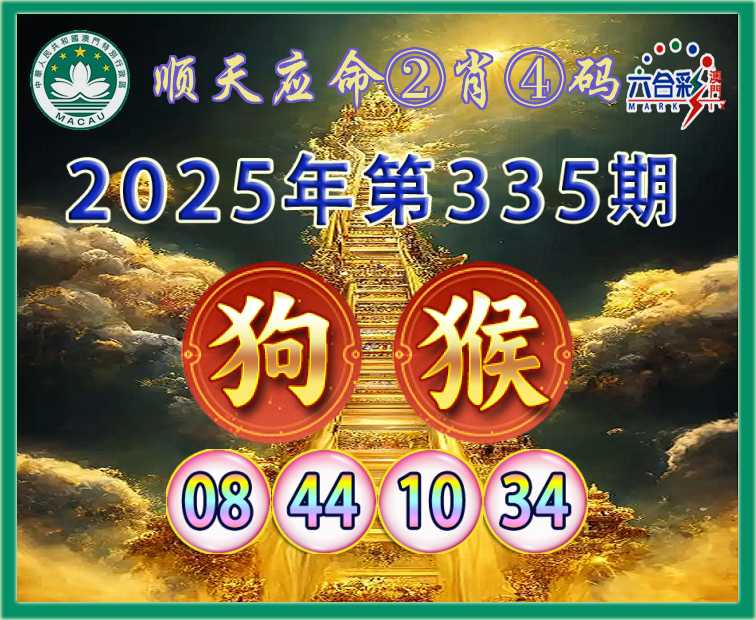 335期:【顺天应命】 🎖️②肖④码🎖️【猴】【08.44.10.34】开:狗44